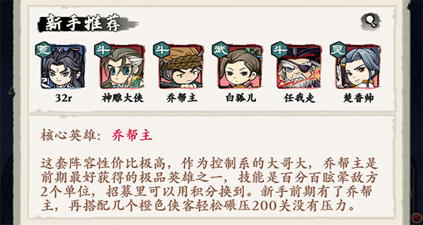 核心英雄:喬幫主。這套陣容性價比極高,作為控制系的大哥大,喬幫主是前期最好獲得的極品英雄之一,技能是百分百眩暈敵方2個單位,招募里可以用積分換到。新手前期有了喬幫主,再搭配幾個橙色俠客輕松碾壓200關沒有壓力。