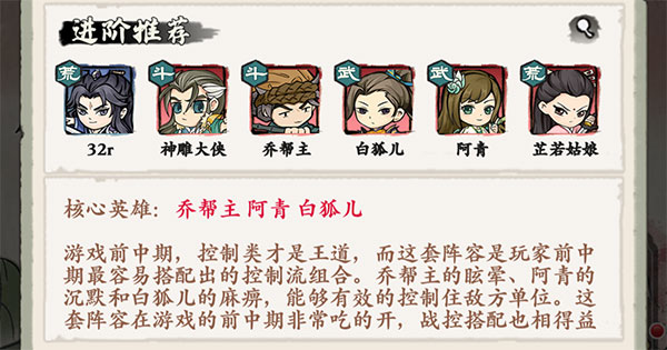 核心英雄:喬幫主、阿青、白狐兒。游戲前中期,控制類才是王道,而這套陣容是玩家前中期最容易搭配出的控制流組合。喬幫主的眩暈、阿青的沉默和白狐兒的麻痹,能夠有效的控制住敵方單位。這套陣容在游戲的前中期非常吃的開,戰控搭配也相得益彰。在中期比較缺卡的情況下,無疑是首選陣容。