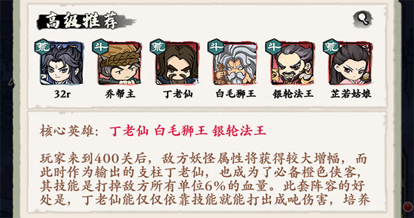 核心英雄:丁老仙、白毛獅王、銀輪法王。玩家來到400關后,敵方妖怪屬性將獲得較大增幅,而此時作為輸出的支柱丁老仙,也成為了自創武林游戲里必備的橙色俠客,其技能是打掉敵方所有單位6%的血量。此套陣容的好處是,丁老仙能僅僅依靠技能就能打出成噸傷害,培養成本極低,此套陣容難點在于白毛獅王、銀輪法王的獲取難度較大,丁老仙可以通過招募積分兌換獲取。