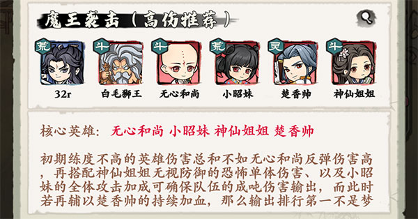 核心英雄:無心和尚、小昭妹、神仙姐姐、楚香帥。初期練度不高的英雄傷害總和不如無心和尚反彈傷害高,再搭配神仙姐姐無視防御的恐怖單體傷害、以及小昭妹的全體攻擊加成可確保隊伍的成噸傷害輸出,而此時若再輔以楚香帥的持續加血,那么輸出排行第一不是夢。