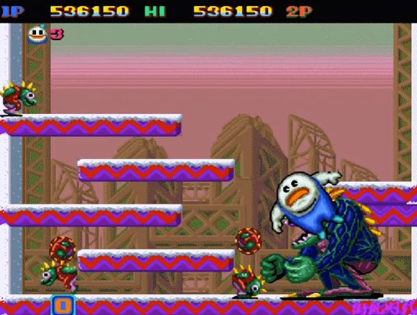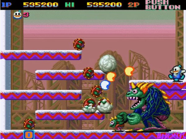攻擊方式是把敵人堆成雪球,破壞雪球或借助雪球去攻擊敵。如果一次性消滅敵人的話,天上就掉很多美味可口的年糕。有一個是要牢記的是,主角只能往上跳,不能往下跳(我們一般熟知的方向鍵向下+跳躍鍵)。每過一定小關有大boss,大小boss都有特點。這個游戲還是耐玩的經典之作。