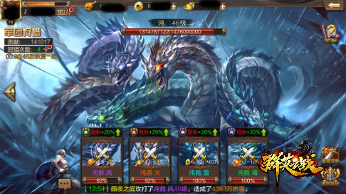 擊敗沌首是具有難度的,需要玩家攜帶不同武將對抗不同等級的沌首,例如:蜀勢力武將可對沌首?風造成20%額外傷害,而吳勢力蜀將可以對沌首?火造成20%的額外傷害,所以這就要求玩家選擇具有針對性的武將來對抗不同類型的沌首,只有這樣才能取得事半功倍的效果。而且只要擊敗任意一個沌首,玩家即可獲得軍團經驗與軍團貢獻,同時還會獲得一次領取獎勵的機會,擊敗高級沌首的獎勵更加豐厚,帶領你麾下軍團共同奮戰,贏取是史無前例的豐厚獎勵!