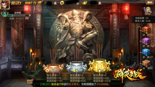 財富在任何游戲中都是不可缺少的資源,而祭拜天神就是《群英之戰》軍團中獲取財富的最重要的途徑,是每個玩家必定要經歷的游戲體驗。在現實中,祭拜都是有規則的,在軍團中也是一樣,軍團的祭天是有限制的,玩家每天只能在青銅祭、琉璃祭、玄天祭中選擇一種進行祭拜,很多玩家在祭拜時隨意選擇,其實這是不對的,在祭壇有個秘密,那就是在琉璃和玄武祭天時很有可能會觸發幸運祭天,并且獲得雙倍軍團經驗和貢獻,擁有軍團貢獻的玩家可以在軍團貨商處兌換各種稀有資源,而且在玄武祭天時還會獲得稀有道具,所以在這里最受推薦的當屬玄武祭天。