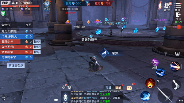 進(jìn)入活動(dòng)場(chǎng)景后中部會(huì)不定時(shí)刷新寶石,拾取后增加陣營(yíng)寶石,擊敗擁有寶石的敵人會(huì)爆出身上所以寶石,可通過(guò)界面左邊快速查看隊(duì)友和敵人的血量和當(dāng)前擁有寶石的數(shù)量,點(diǎn)擊旁邊的“搶奪”即可自動(dòng)追殺該玩家!