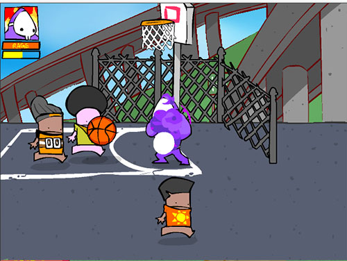 第七關(guān):籃球場(chǎng)。有人會(huì)拿籃球扔你,還有就是可以在球籃下按著A按上,投籃?。?!動(dòng)作很有趣。記住把籃球也拍著走,以后也會(huì)有用的。要拍著籃球,推著足球。