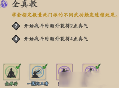 我選的少林6種搭配全真4種,由于前期沒經營好沒學完,學完后遺忘少林長拳就行了剛好10個,加成也剛好達成。