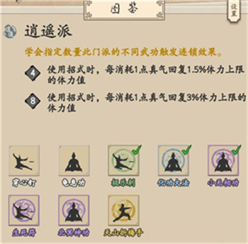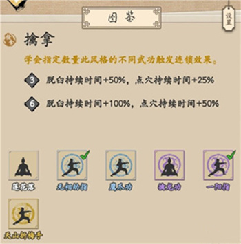 10、主界面左下角圖鑒有所有武功詳情,以及武功套裝效果。類似于自走棋的套路流派。(目前沒有試出開荒最優解)