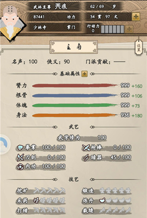 3.提升武功上限不要急,少林的話按著劇情走到了時間自動提升,其實好像就是學會一個武功就加10點,因為只能學10種,上限100點。