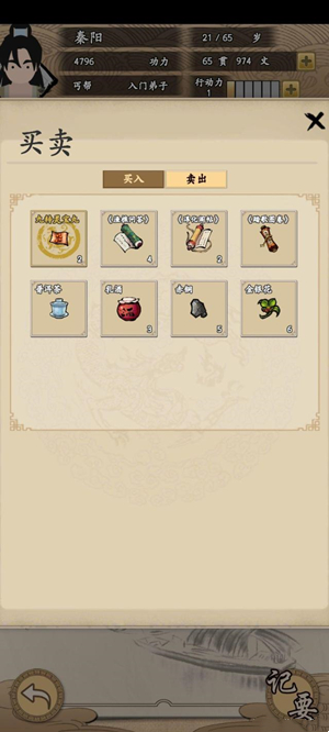 江湖開啟之后,每年第一件事:【活動】—【買賣】—【藥莊】里看有沒有加一點行動力的【健氣丹】,有的話去看加屬性的廣告,把那丹藥賣了攢錢買【健力丹】,這樣行動力完全不缺,甚至到后期溢出!
