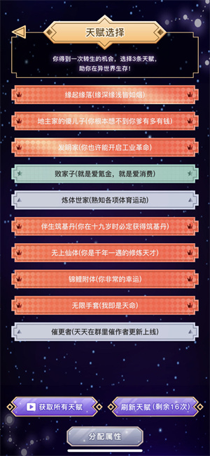在近期熱度飆升的人生模擬器系列中,異世界轉生模擬器官方版稱得上是一款趣味十足的模擬文字游戲。玩家只需輕松動動手,就能在游戲里盡情體驗截然不同的精彩人生。游戲內,各種各樣的天賦彼此交織,為你描繪出千差萬別的人生軌跡,大量爽文劇情更是能讓你深切感受轉生成異界龍傲天的奇妙滋味。