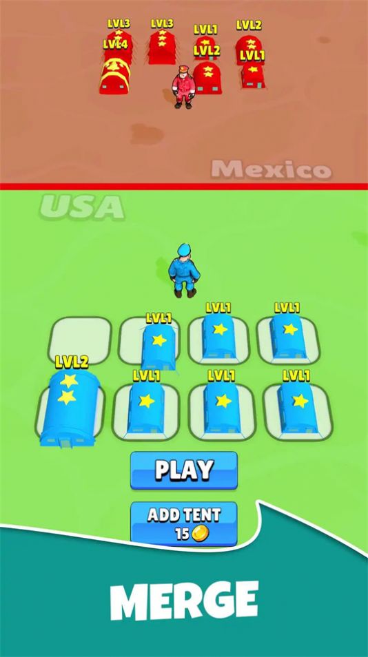 1. 玩家要借助合并的方式來實現帳篷的升級,升級后可獲取更高級別的士兵等。