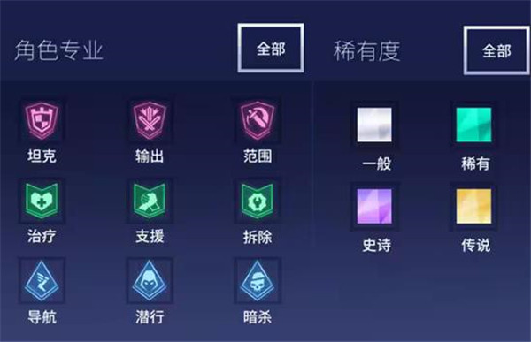 1、英雄角色可按照角色專業和稀有度劃分,角色專業:坦克、輸出、范圍、治療、支援、拆除、導航、潛行、暗殺;
