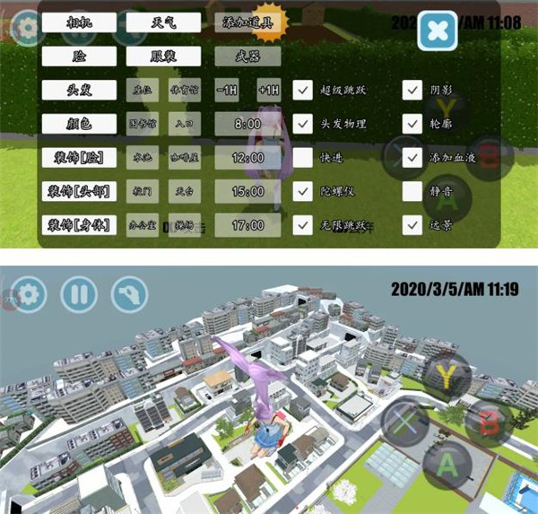 3、左上角的設(shè)置可以設(shè)置超多內(nèi)容:可以傳送到好多個(gè)地方,可以隨時(shí)隨地?fù)Q衣服換發(fā)型等等,可以改變天氣,可以隨時(shí)擁有武器,可以改變時(shí)間,可以設(shè)置陰影。