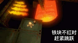 第7根蠟燭在紅色鐵塊后方,鐵塊是左右搖擺的,從左向右時是紅色的會融化蠟燭,在到達(dá)最右端時,紅色消失在這時立刻跳上鐵塊,迅速通過,點燃第7根蠟燭。